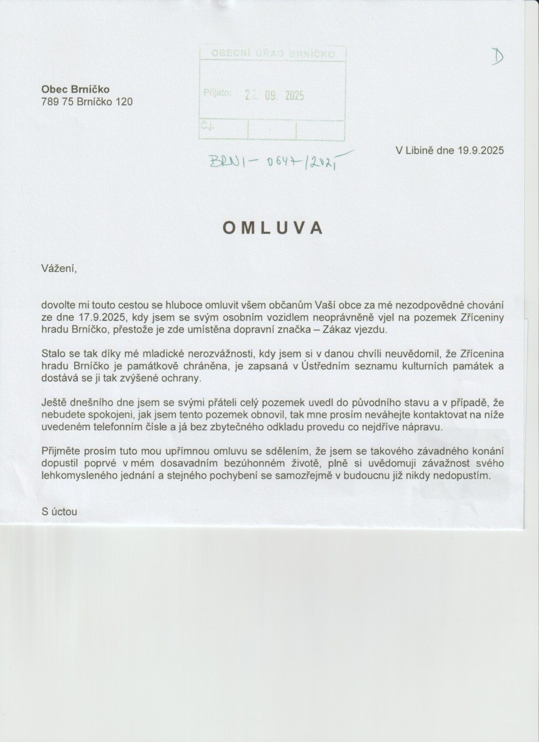 Považujeme za důležité sdělit, že v současné době je škoda způsobená na kulturní památce - hrad Brníčko v šetření Policie ČR a bude po pachatelích vymáhána.
