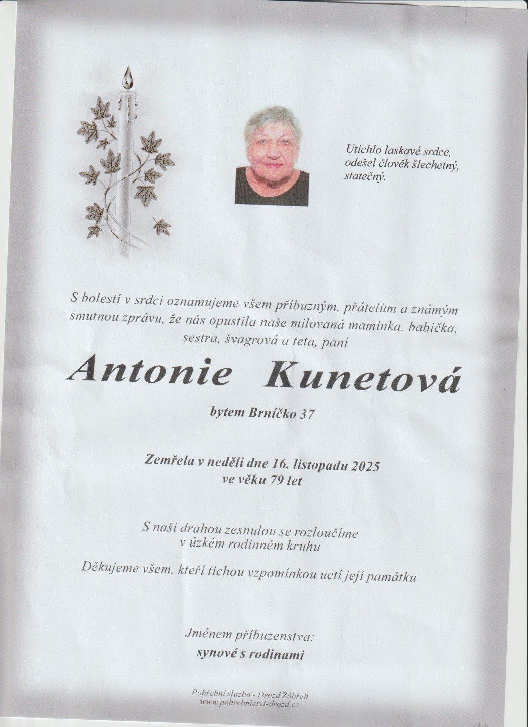 16. listopadu 2025 Antonie Kunetová, Brníčko 37, 79 let