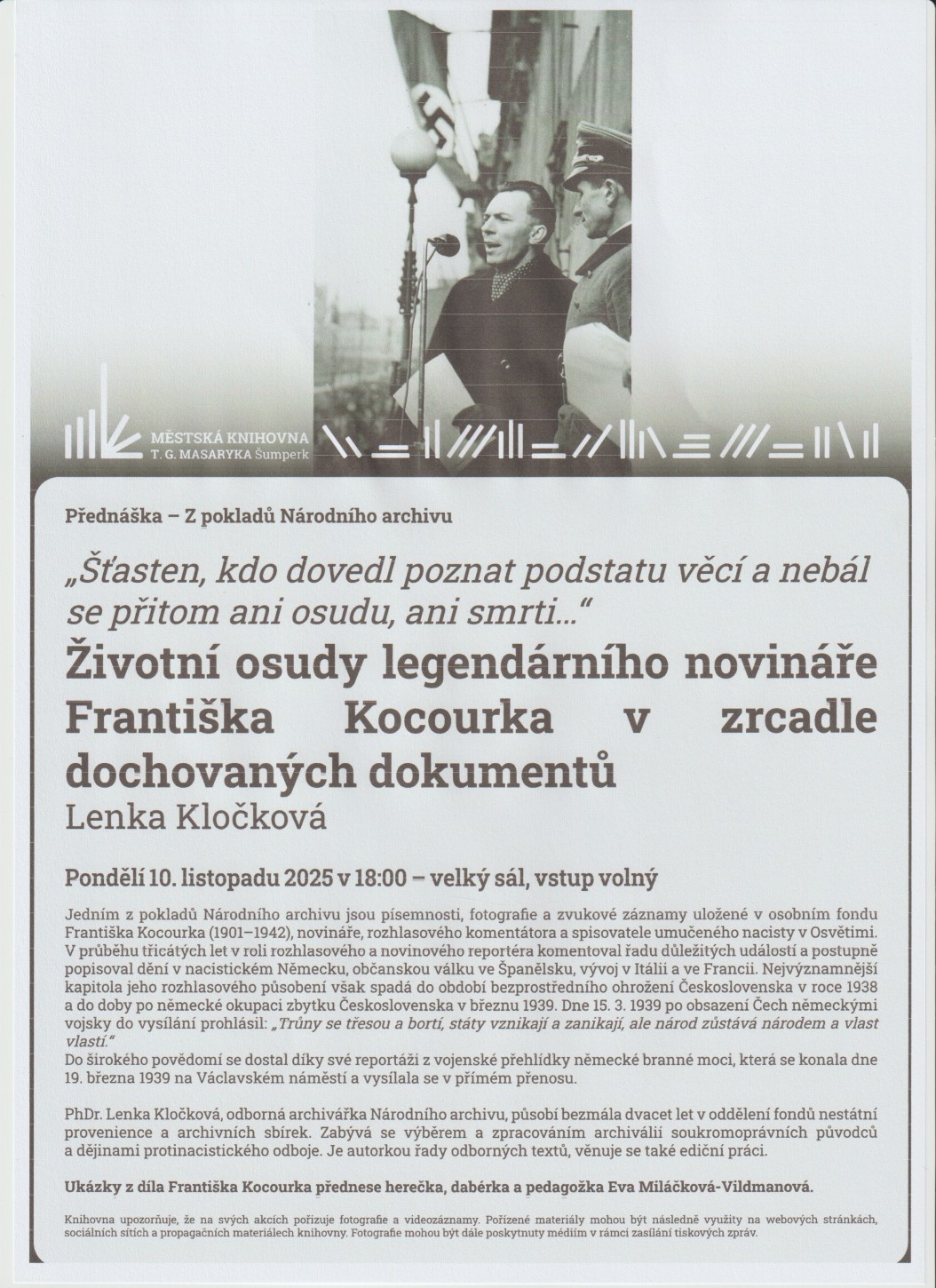 Přednáška z pokladů Národního archivu o Františku Kocourkovi - Knihovna Šumperk