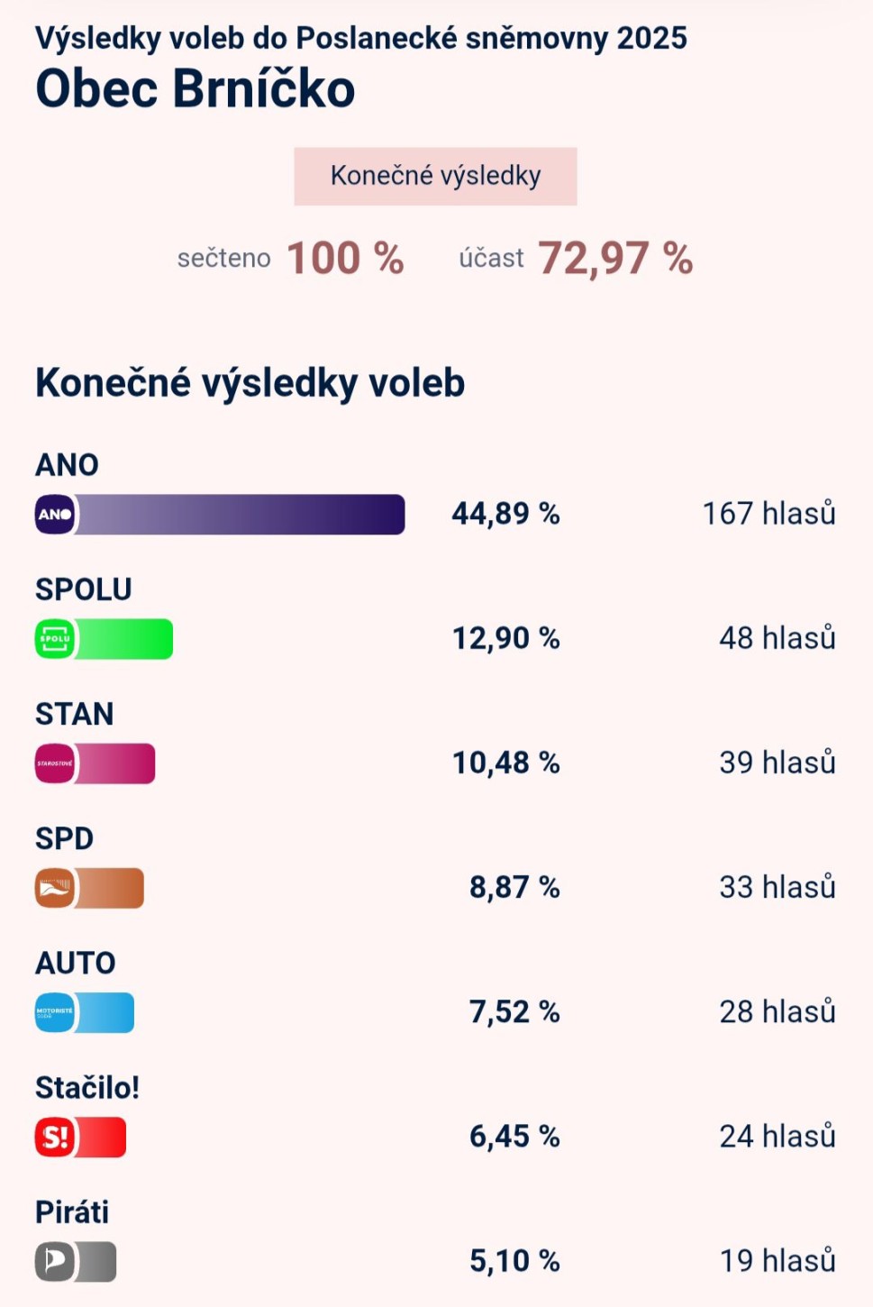 Jak se volilo do Poslanecké sněmovny u nás? Některé strany hlasy nedostaly, některé jich dostaly hodně. Procento účasti 72,97 ukazuje, že lidem na volbě záleží. Naše výsledky téměř kopírují celorep
